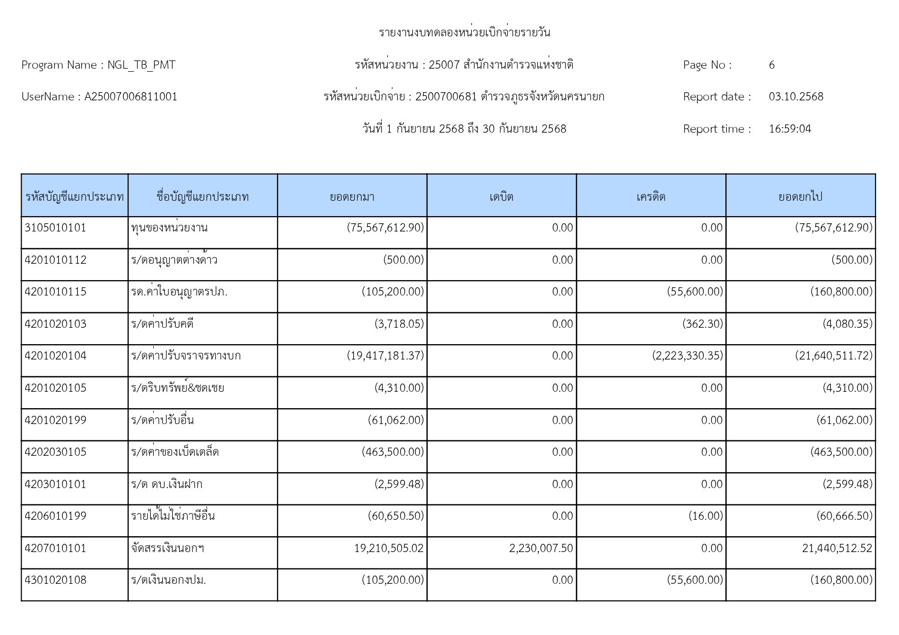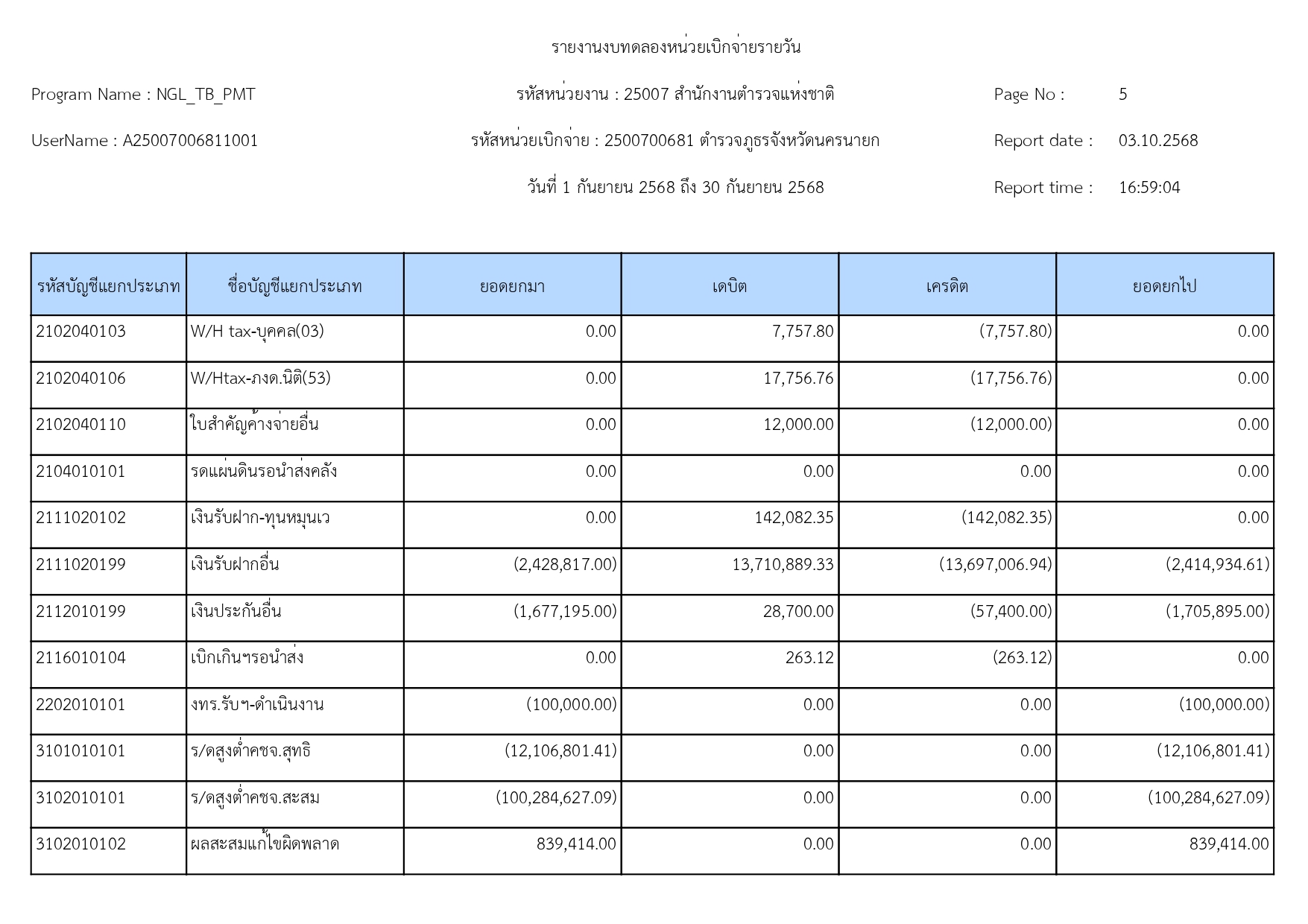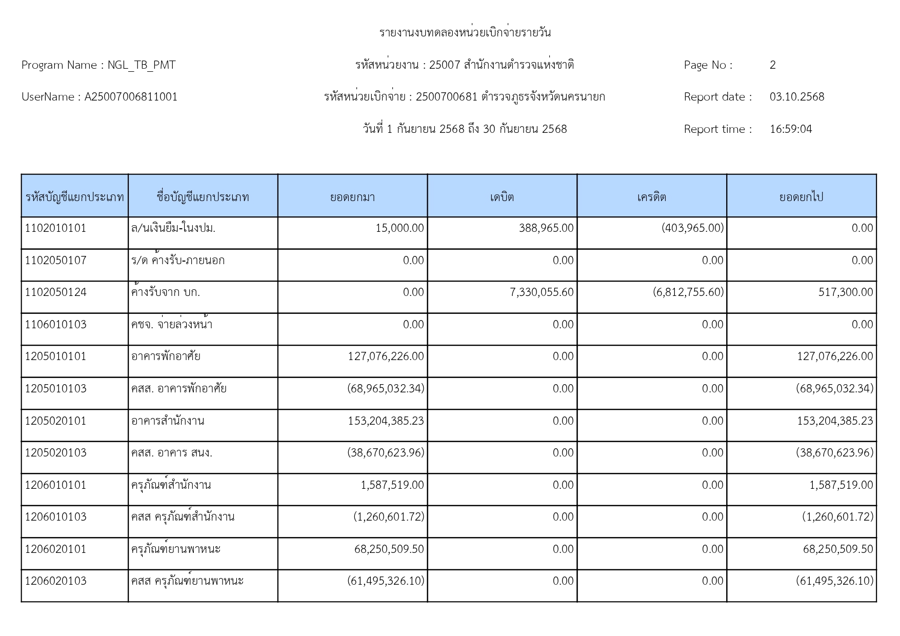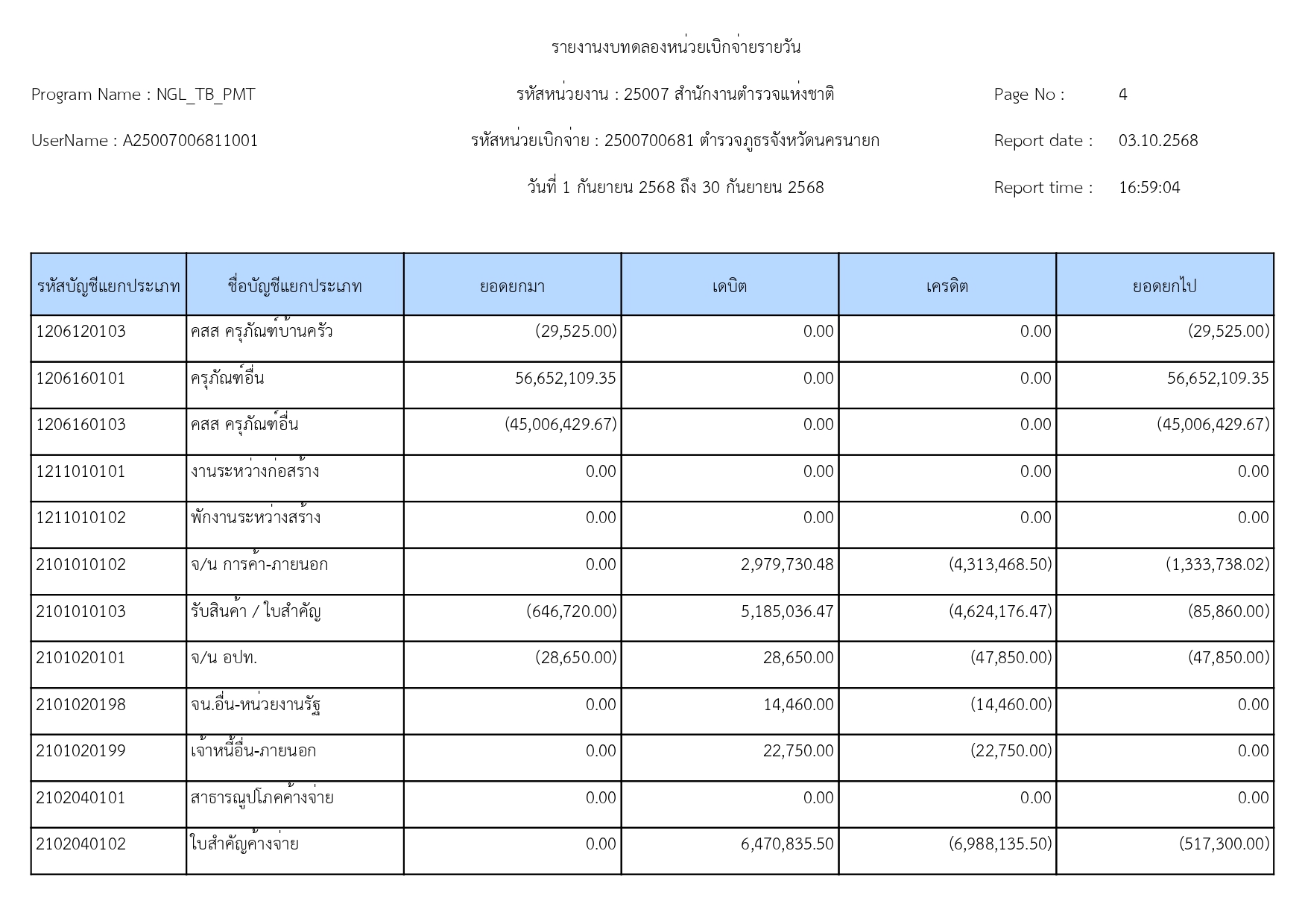 ผลการดำเนินงานทางบัญชีของตำรวจภูธรจังหวัดนครนายก ปีงบประมาณ68 15 ตุลาคม 2568 โดย adminnakhonnayok / ข่าวประชาสัมพันธ์,ข่าวจัดซื้อจัดจ้าง,งานงบประมาณแผนงาน 1.รายงานงบทดลองเดือนกันยายน 2568 [ดาวโหลดเอกสาร >>คลิ๊ก<<] 2.รายละเอียดประกอบรายการบัญชีที่สำคัญของงบทดลองประจำเดือนกันยายน2568 [ดาวโหลดเอกสาร >>คลิ๊ก<<] FacebookFacebookXXLINELine