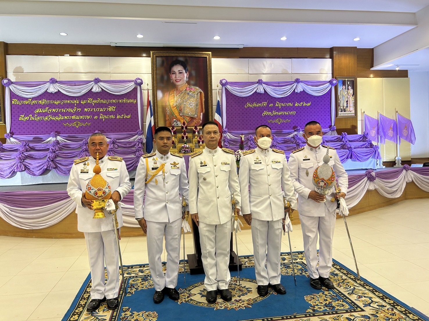 – เวลา 17.30น. ร่วม พิธีถวายเครื่องราชสักการะและวางพานพุ่ม และพิธีจุดเทียนถวายพระพรชัยมงคล สมเด็จพระนางเจ้าฯ พระบรมราชินี เนื่องในโอกาสวันเฉลิมพระชนมพรรษา 3 มิถุนายน 2567ณ หอประชุม สุพรรณิการ์ ชั้น 2 อาคารศูนย์อาหารปลอดภัยและนันทนาการบริการประชาชน ศาลากลางจังหวัดนครนายก