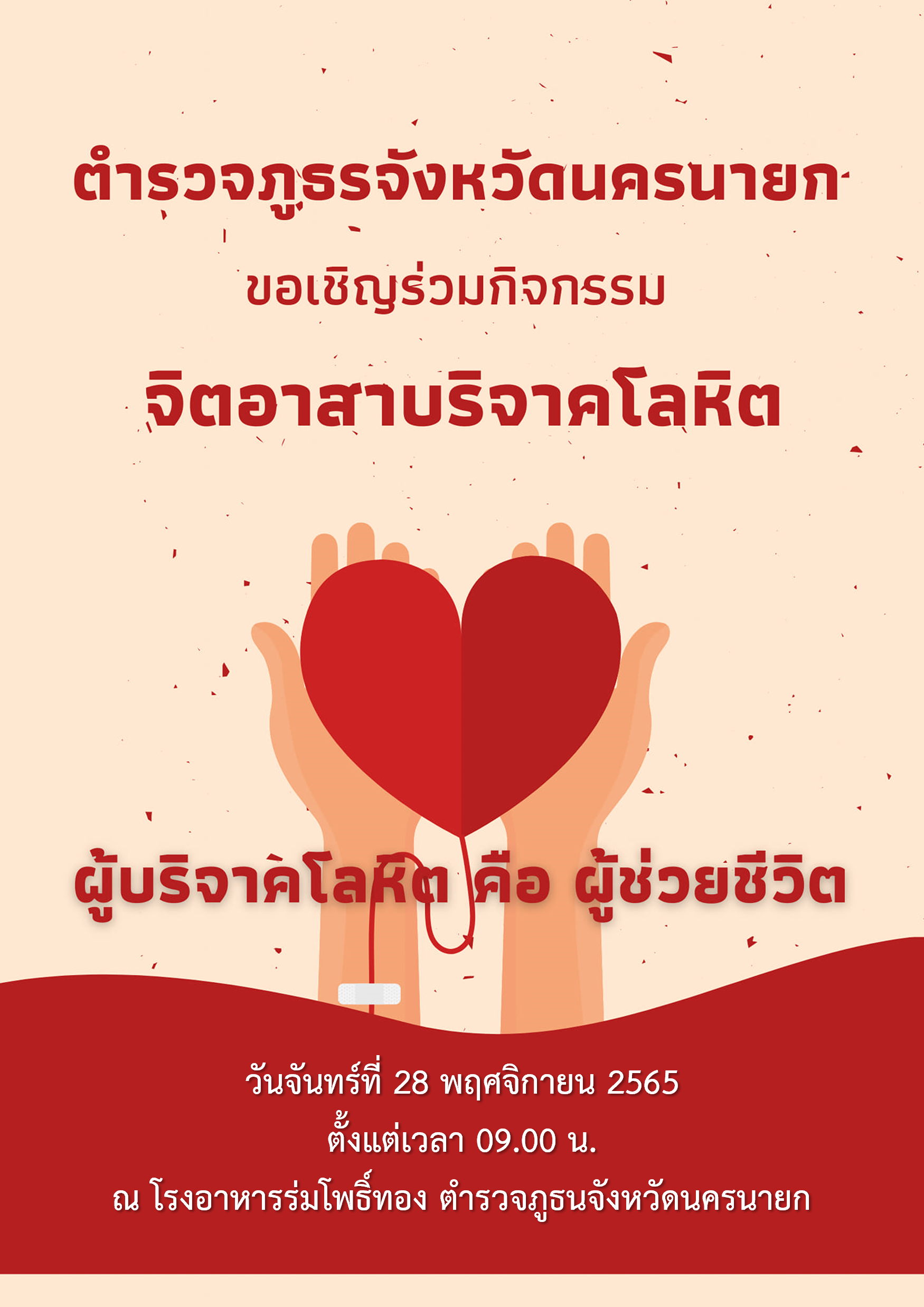 ตำรวจภูธรจังหวัดนครนายก ขอเชิญร่วมกิจกรรมจิตอาสาบริจาคโลหิต โครงการ “จิตอาสา บริจาคโลหิต ตำรวจภูธรจั