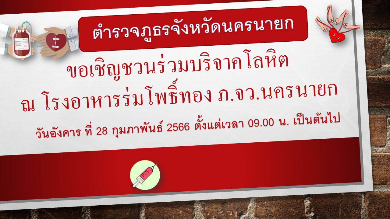 ตำรวจภูธรจังหวัดนครนายก ขอเชิญร่วมกิจกรรมจิตอาสาบริจาคโลหิต โครงการ “จิตอาสา บริจาคโลหิต ตำรวจภูธรจั